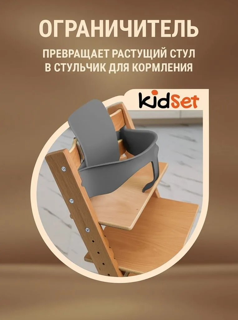 Дополнительно можно укомплектовать столиком Kidset, превратив растущий стул в полноценный компактный стульчик для кормления на смену громоздким собратьям.