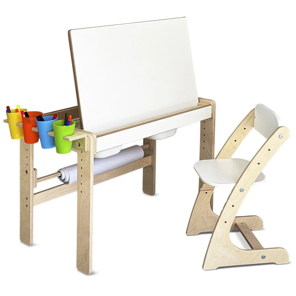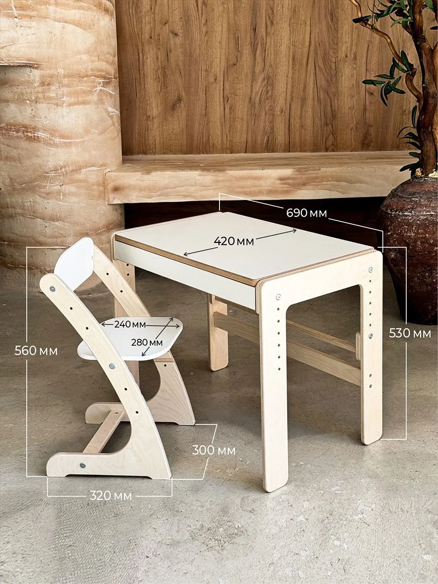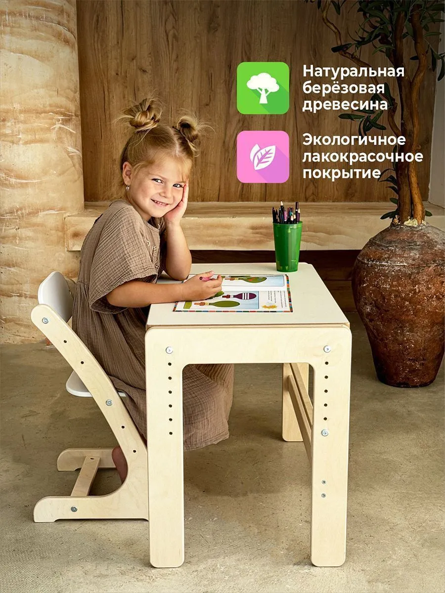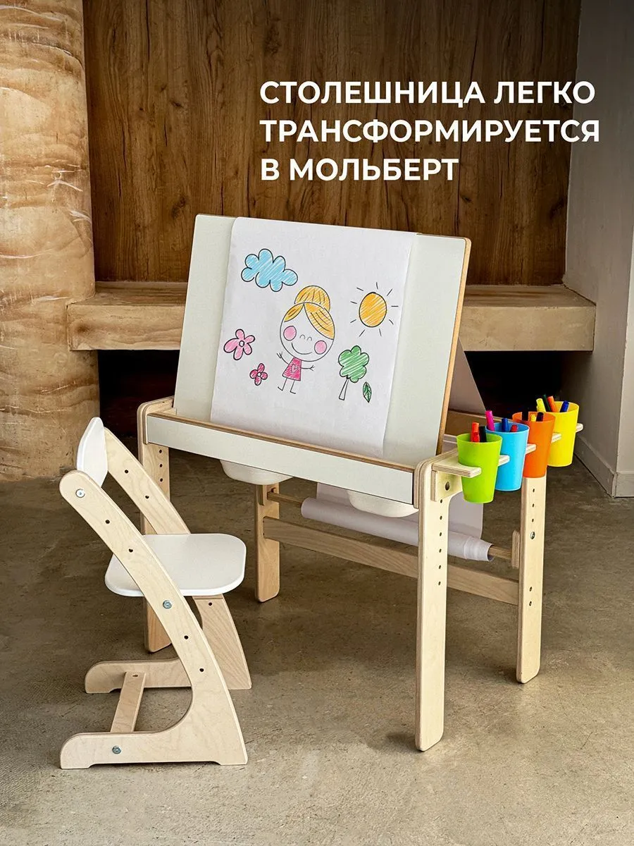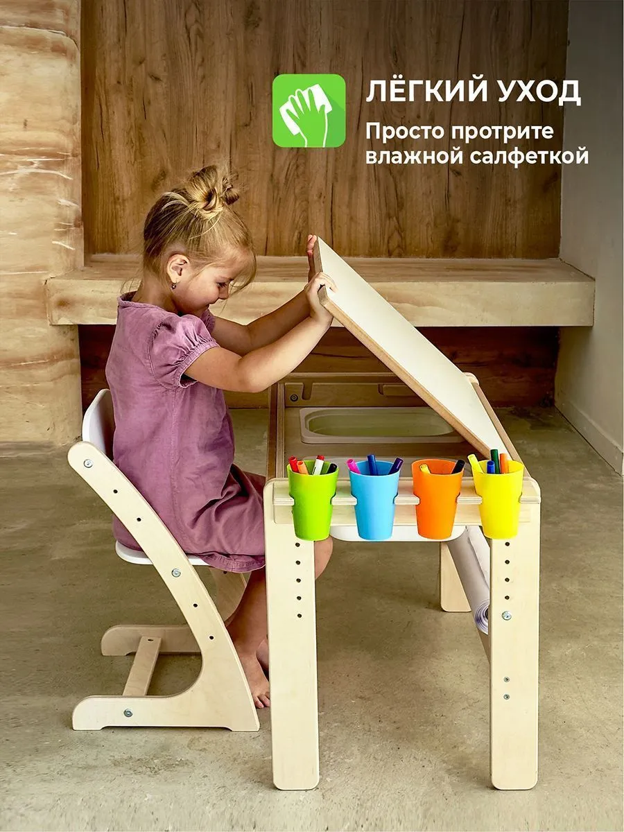 Письменный столик трансформируется в мольберт, а также его можно установить как наклонную парту для чтения и письма. Столик и стульчик выполнены из качественной и безопасной березовой фанеры. Столешница изготовлена из МДФ. Ее размеры 69х42 см обеспечивают достаточно места для творчества и перекусов, помогая ребенку содержать рабочую зону в порядке.