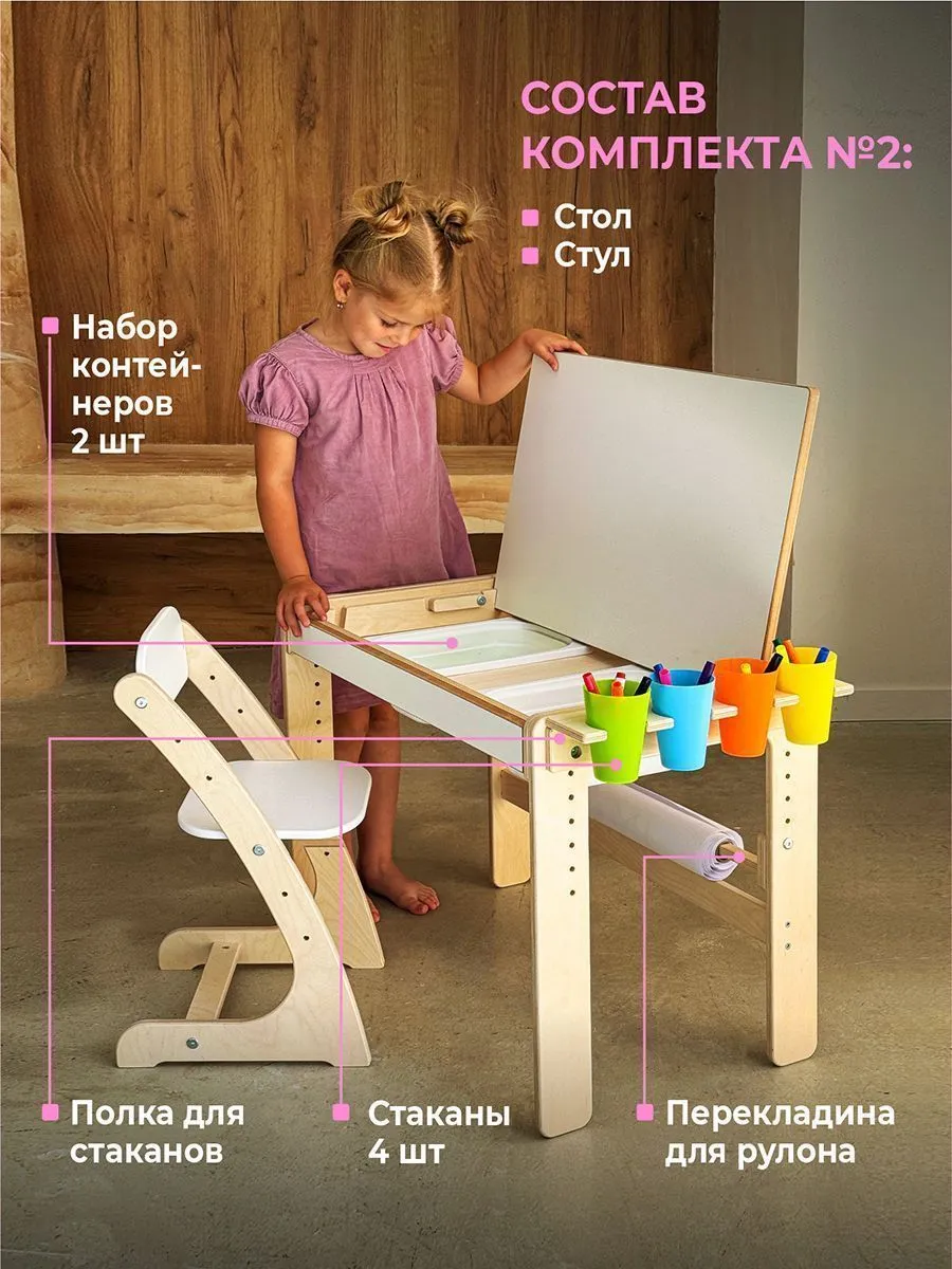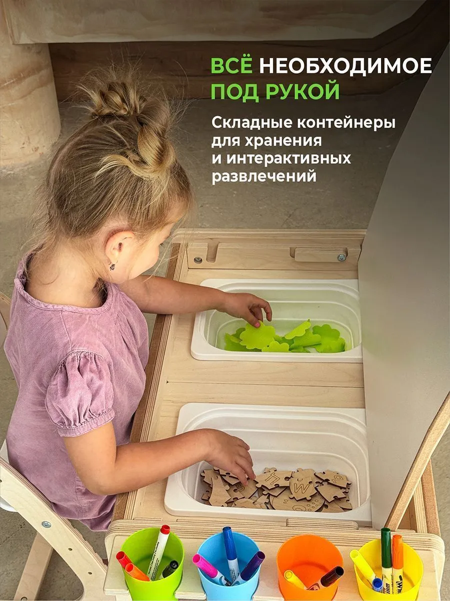 Расширенная комплектация включает все самое необходимое для организации игрового процесса в стиле ikea: в набор входят растущий стол, стул с удобной спинкой, держатель для бумаги, пластиковые контейнеры для хранения, рулон бумаги для рисования и стаканы с полкой для карандашей или фломастеров. Складные органайзеры для игрушек и мелочей помогут поддерживать порядок на рабочем месте, что очень актуально для детской комнаты.