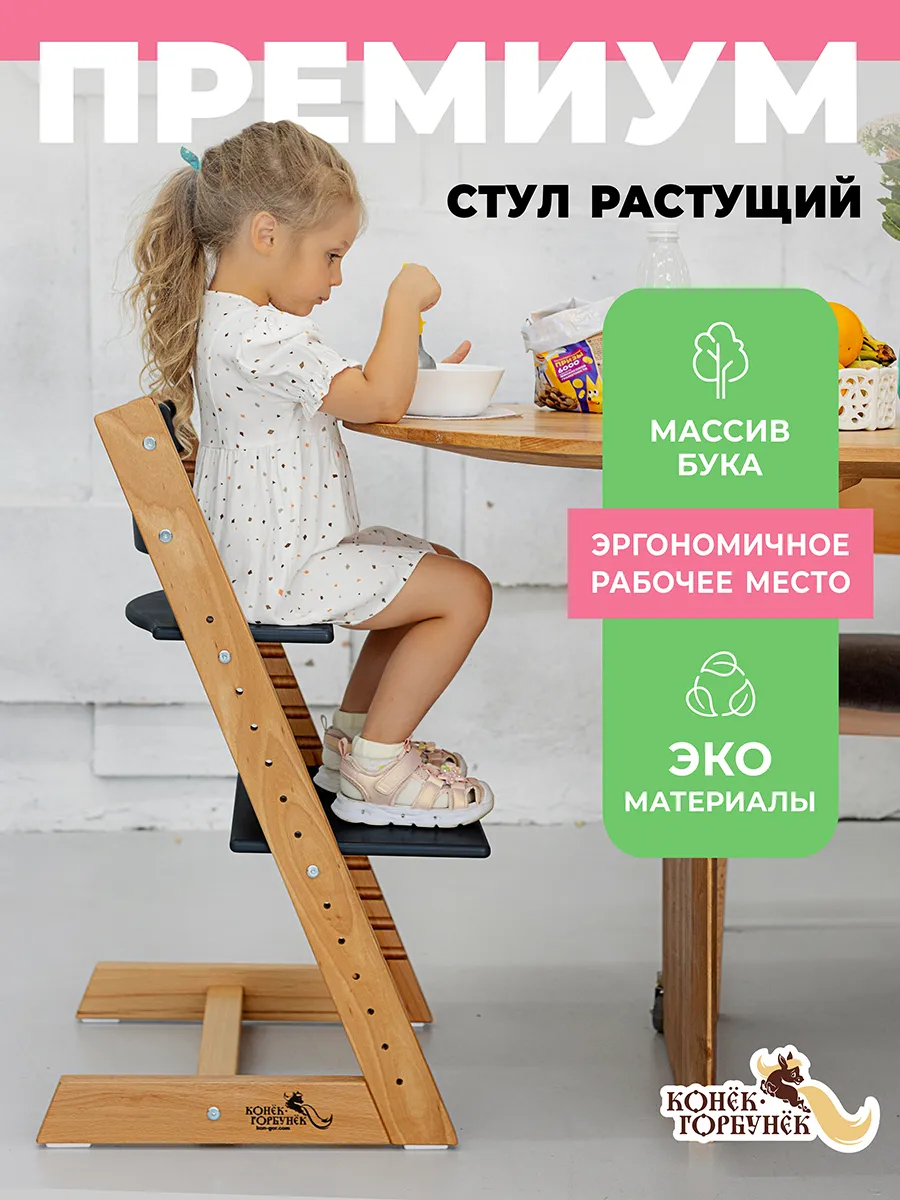 Для ценителей фактуры и натуральных материалов у нас есть специальное предложение — растущий стул из массива бука. Допустимая нагрузка составляет 100 кг, а весит он побольше своих «коллег по цеху» — целых 7,7 кг (все же массив, потому и вес значительно увеличен). Габариты Премиума такие же, как и у Комфорта, за исключением ширины сиденья и подножки, — они незначительно шире и глубже, Премиум выше стула Комфорт на 3 см и на 4 см выше стула Стандарт. Обращаем внимание, что сиденье и подножка у данной модели выполнены из фанеры бука, т. к. на них приходится самая большая нагрузка, это сделано для большей безопасности и увеличения срока службы. Также, как и у модели Комфорт Pro, у модели Премиум двойная изогнутая ортопедическая спинка. Сиденье и подножка вставляются в уже имеющиеся пазы в ножках стула, так же, как и в стуле Стандарт, перемычки для жесткости и устойчивости стула под сиденьем и подножкой изготовлены также из бука. Цветовых решений у премиальной модели растущего стула 9 и 13 вариантов расцветок комплектов подушек для спинки и сиденья. Гарантия на стул Премиум составляет 5 лет.