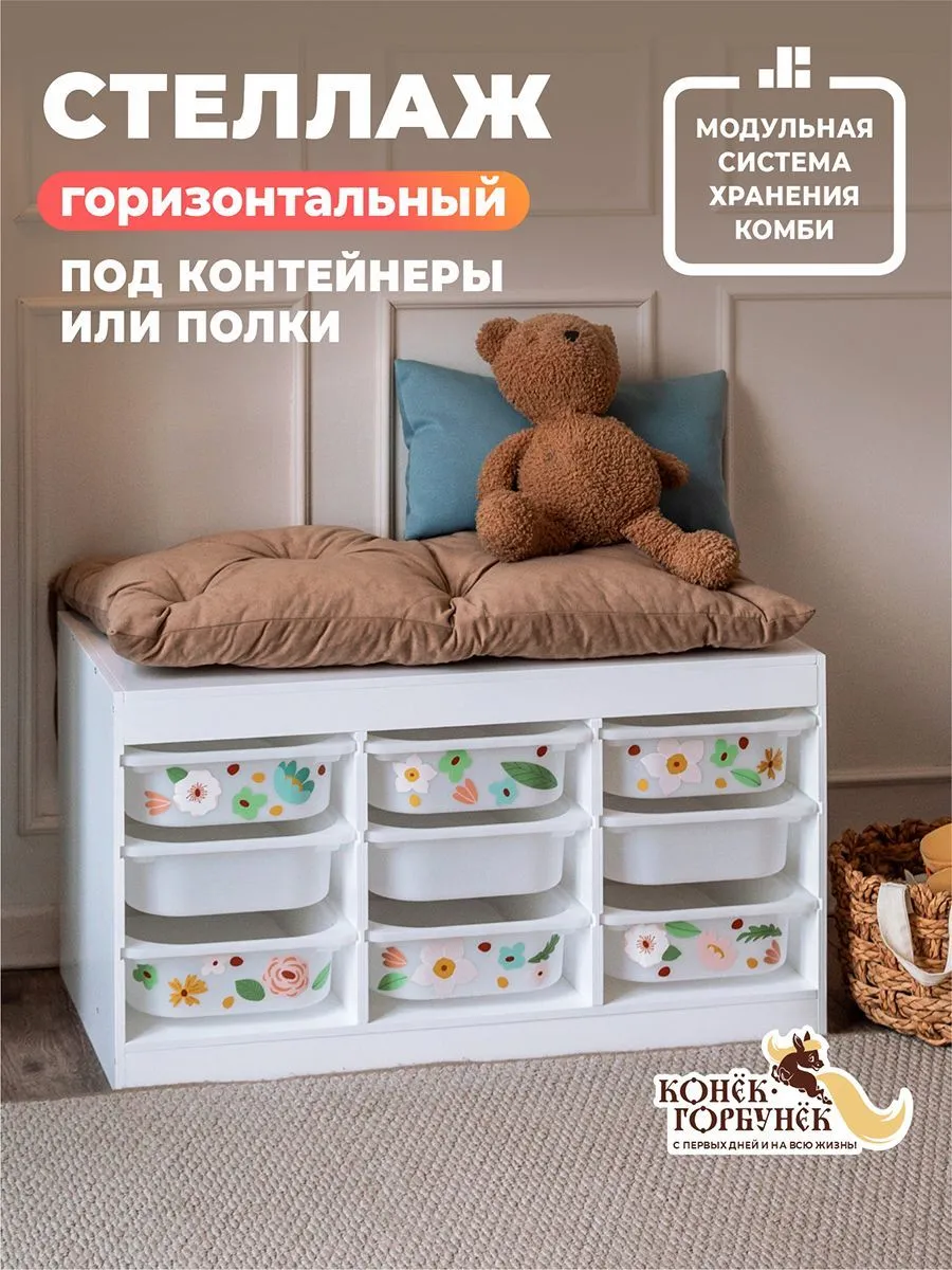 Главная особенность серии «Комби» — модульный принцип хранения. Вы можете самостоятельно комплектовать стеллаж так, как удобно именно вашей семье: дополнять его полками или контейнерами в зависимости от задач хранения. Это особенно удобно, когда система должна меняться по мере роста ребенка и изменения потребностей семьи. Стеллаж совместим с контейнерами Труфаст, что позволяет легко организовать удобное и наглядное хранение. При этом важно: контейнеры и полки в комплект не входят и приобретаются отдельно. Это даёт возможность выбрать именно ту комплектацию, которая нужна вам: под игрушки, книги, конструкторы, одежду, канцелярию или товары для творчества.