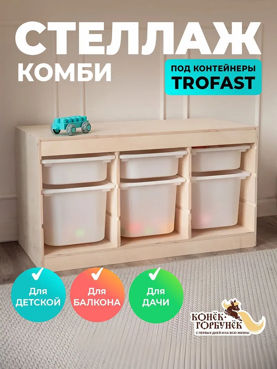 Главная особенность серии «Комби» — модульный принцип хранения. Вы можете самостоятельно комплектовать стеллаж так, как удобно именно вашей семье: дополнять его полками или контейнерами в зависимости от задач хранения. Это особенно удобно, когда система должна меняться по мере роста ребенка и изменения потребностей семьи. Стеллаж совместим с контейнерами Труфаст, что позволяет легко организовать удобное и наглядное хранение. При этом важно: контейнеры и полки в комплект не входят и приобретаются отдельно. Это даёт возможность выбрать именно ту комплектацию, которая нужна вам: под игрушки, книги, конструкторы, одежду, канцелярию или товары для творчества.