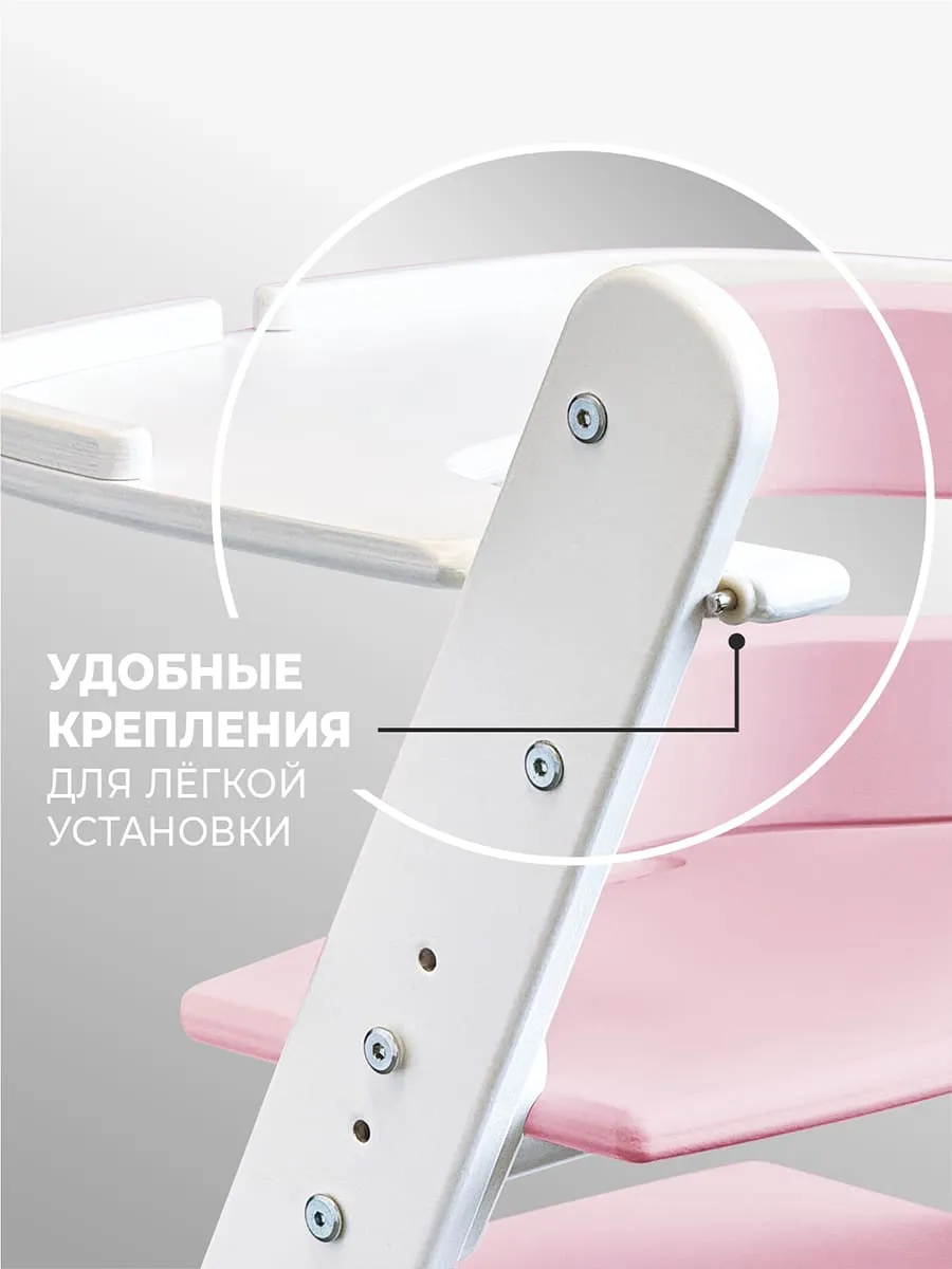 Комплект для кормления включает в себя стульчик, растущий вместе с вашим ребенком, и съемный столик с удобными бортиками и ремнем-стропой, что делает его отличным помощником в формировании правильной осанки с самого раннего возраста.